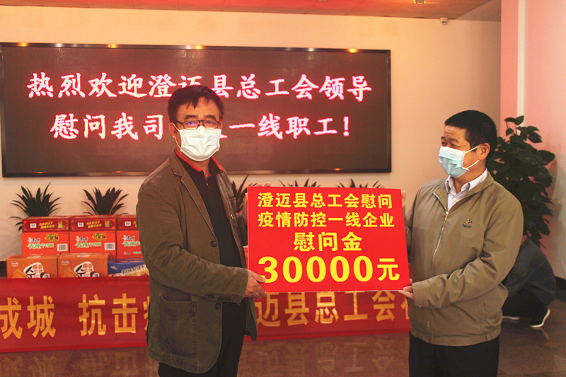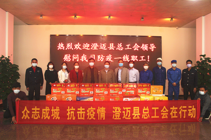 2月13日,澄迈县委常委魏和金、县总工会主席潘思群一行到我司看望慰问近日来一直坚守在疫情防控物资原料生产一线的工作人员,向他们的辛勤付出表示感谢,嘱咐大家一定要保重身体,注意自身的防护工作,并为他们送去3万元慰问金和饼干、凉茶、方便面等5000元慰问物资。
