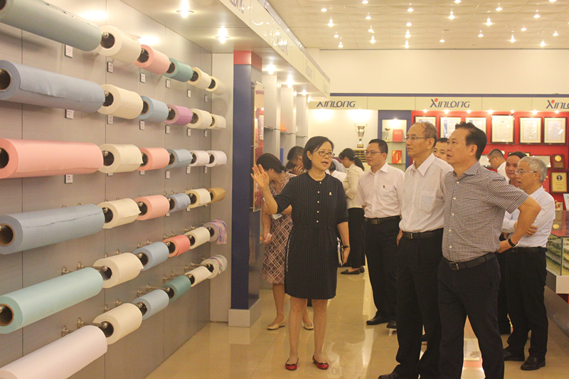 随后,调研团饶有兴趣地参观了集团公司展厅。参观期间,鲜祖德副局长鼓励全体欣龙人,一定要继续努力把公司做大做强,勿忘初心,牢记公司使命,做好国内无纺工业的表率,为产业服务,为海南自贸区建设发展服务。