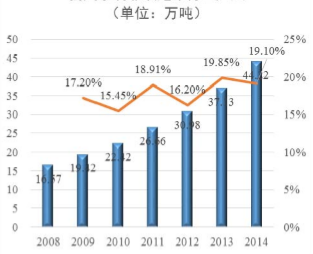 根据中元智盛对水刺非织布行业的调查分析,近几年水刺非织造布产量高速增 长,至 2014 年产量达 44.22 万吨,同比增长 19.10%。根据中国产业用纺织品行业协会数据,2014 年水刺非织造布产量占非织造布产量的 10%。水刺工艺是所 有生产非织造布工艺中增长快的工艺。